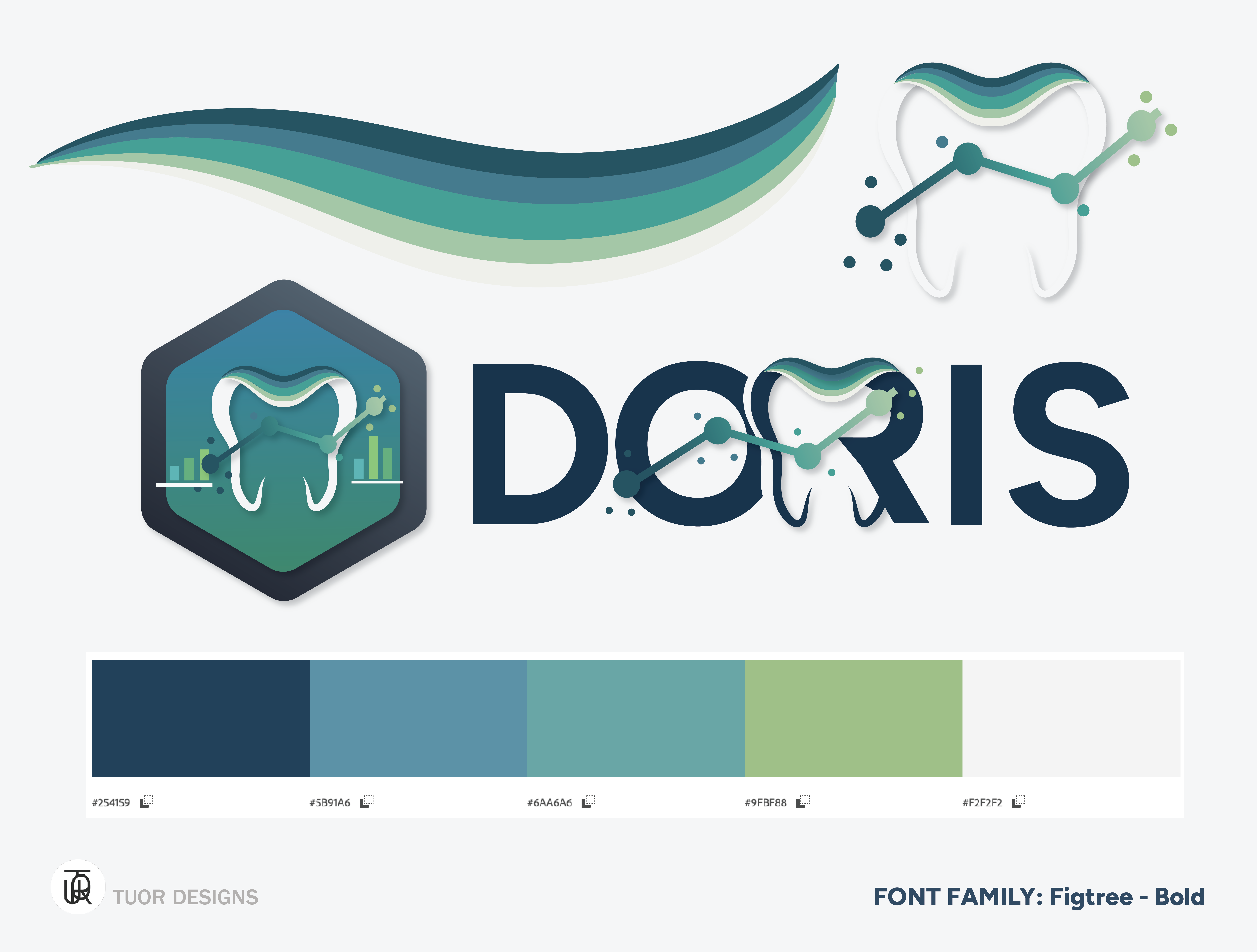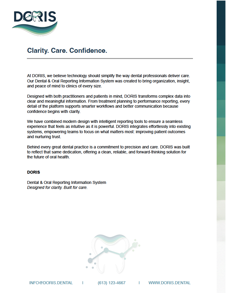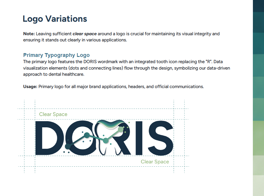 The DORIS brand was built to feel modern, trustworthy, and calm, using navy blues, mint greens, and teal to balance professionalism with a fresh, welcoming tone. The full branding system includes versions of the typography logo, a badge logo, a simple tooth accent icon, a decorative swoop graphic, and detailed rules for usage and colour palette. I also edited and expanded the existing programmer’s style guide to align the development standards with the updated visual identity.